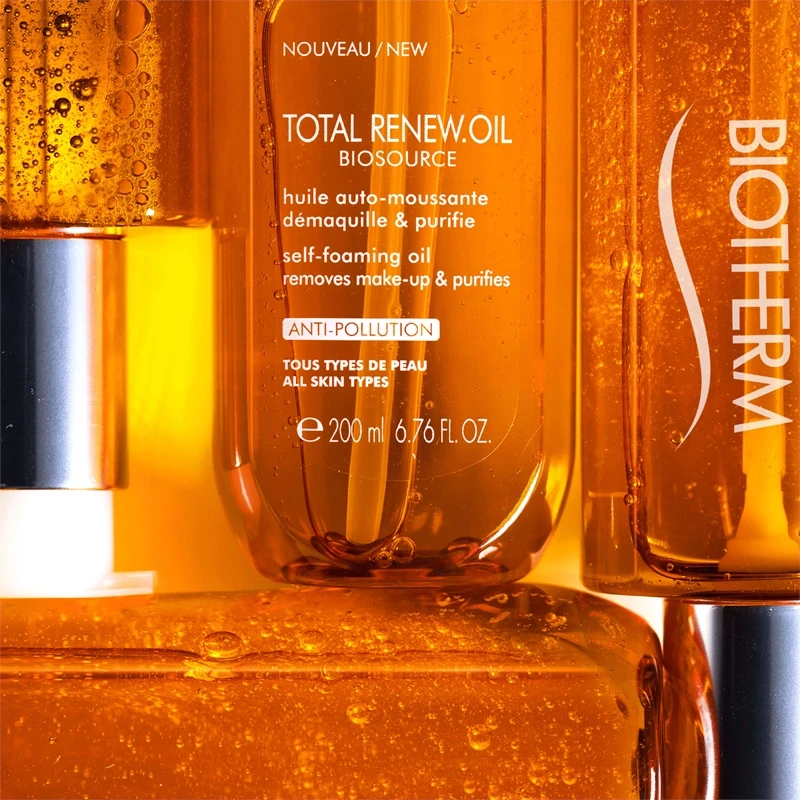 Réduire les efforts et multiplier les effets. L’huile moussante nettoyante Biotherm Biosource Total Renew Oil démaquille parfaitement le maquillage waterproof tout en nourrissant la peau grâce à sa structure huileuse de qualité. Elle permet d’éliminer les dernières traces d’impuretés et renouvelle la beauté de la peau en une seule étape.