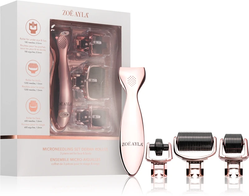 Découvrez votre nouvel allié beauté. Le roller à micro-aiguilles pour le visage et le corps Zoë Ayla Micro-Needling Derma Roller Set est capable de miracles sur la peau de votre corps et de votre visage. Il est équipé de 3 têtes interchangeables à longues aiguilles en inox qui exfolient délicatement la peau pour la rendre plus douce, plus souple et plus ferme.